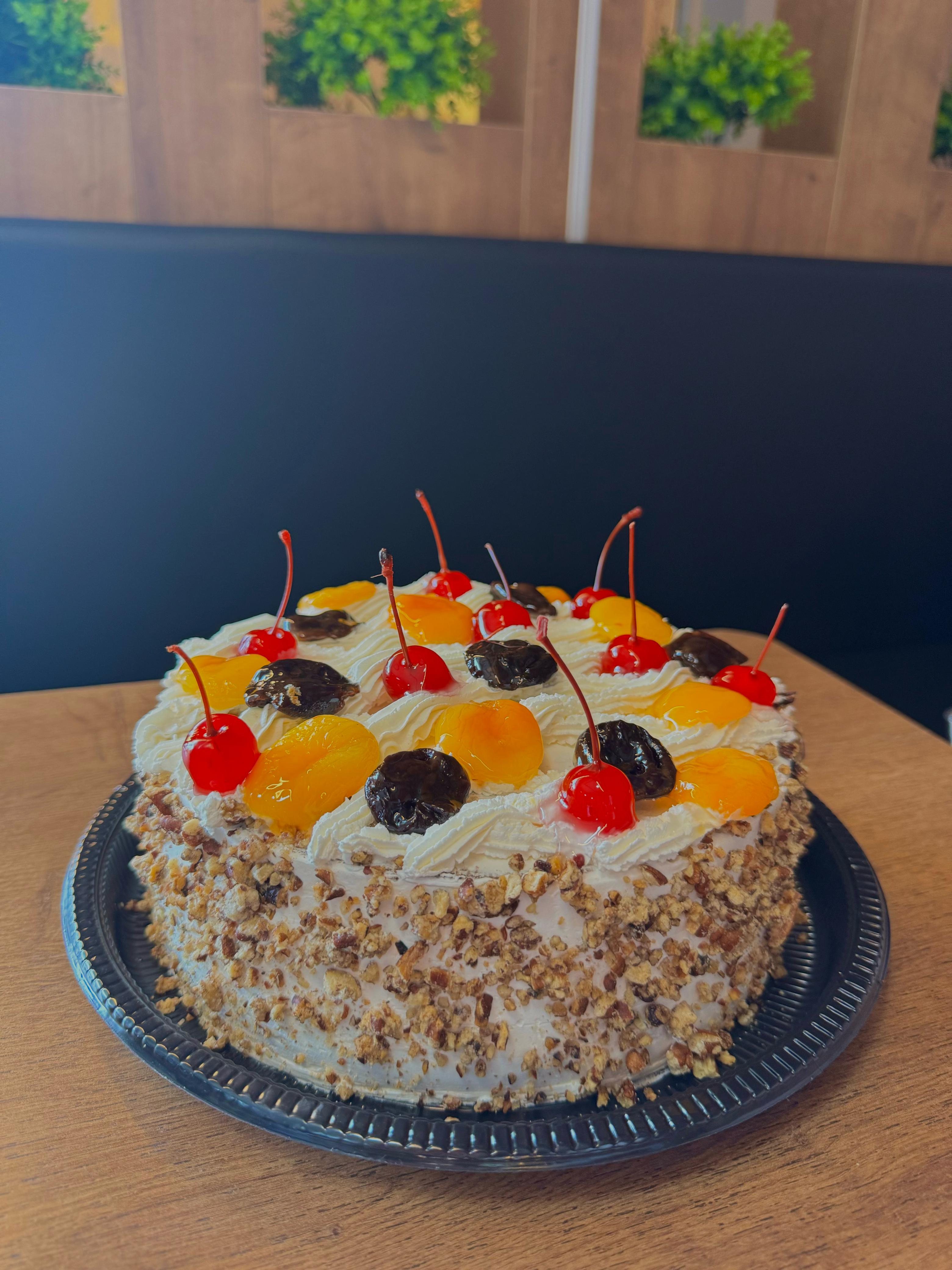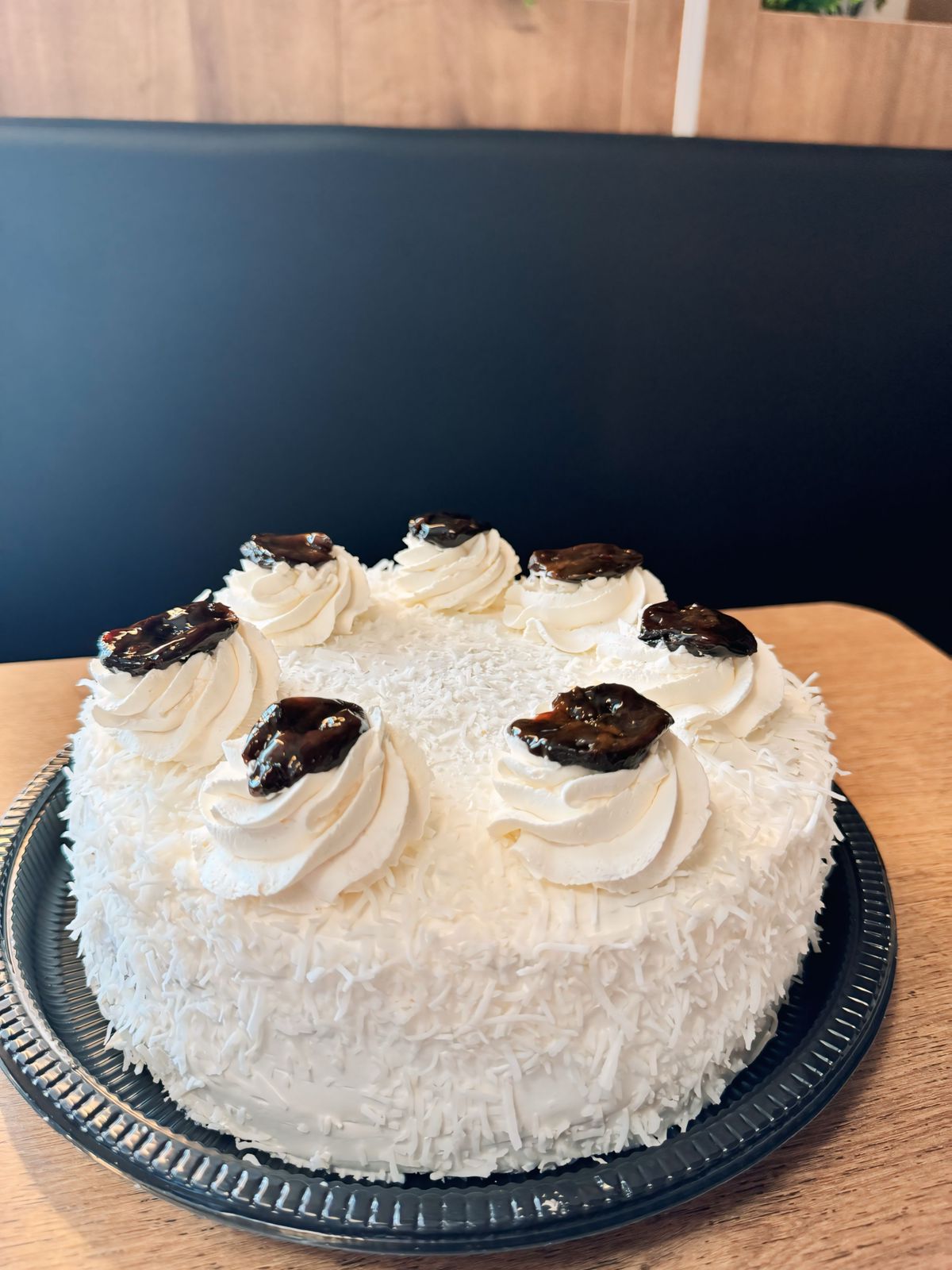 Massa: Pão de ló Branco Recheio: Creme de coco com ameixa Decoração: Coco com ameixa