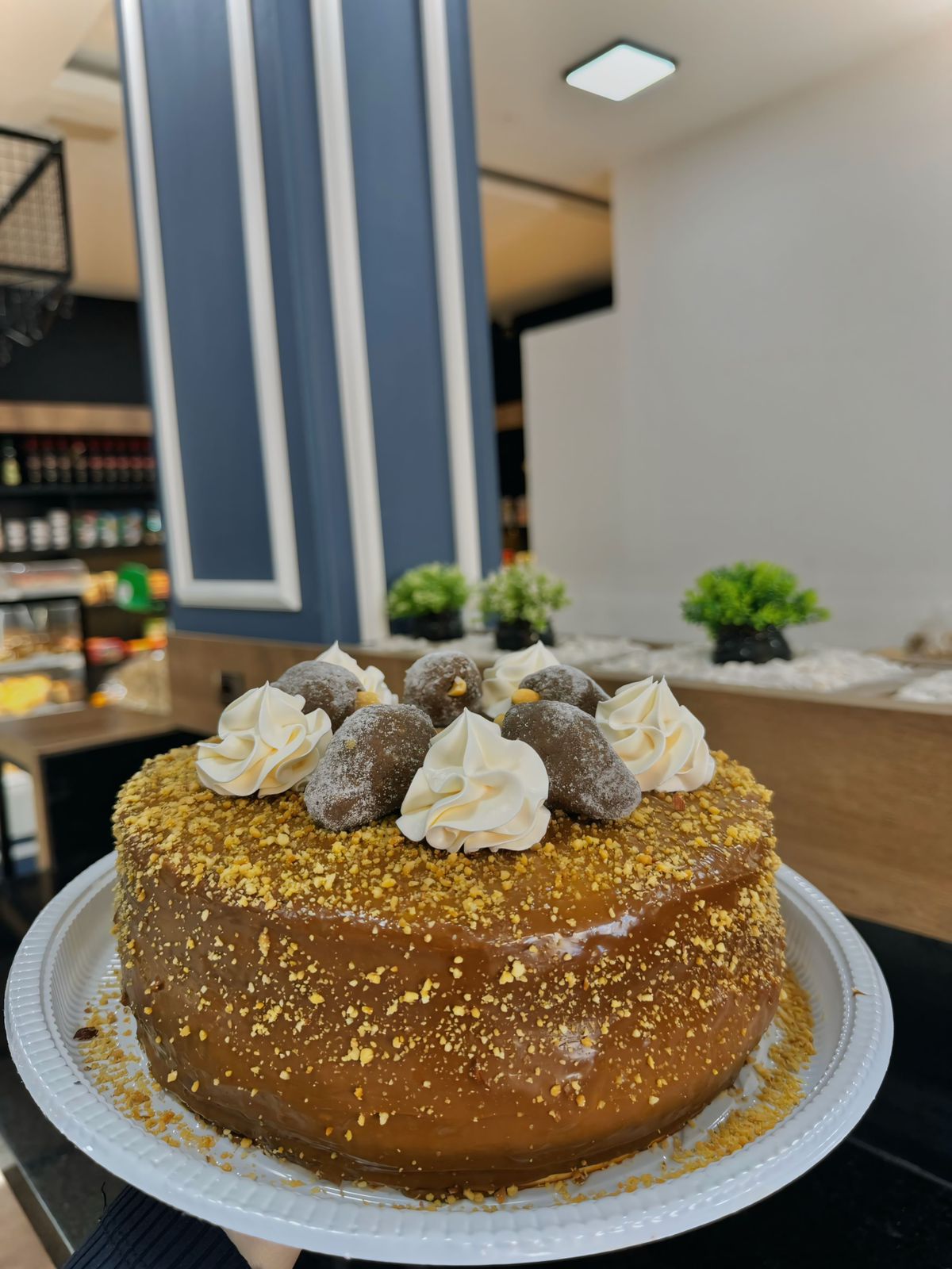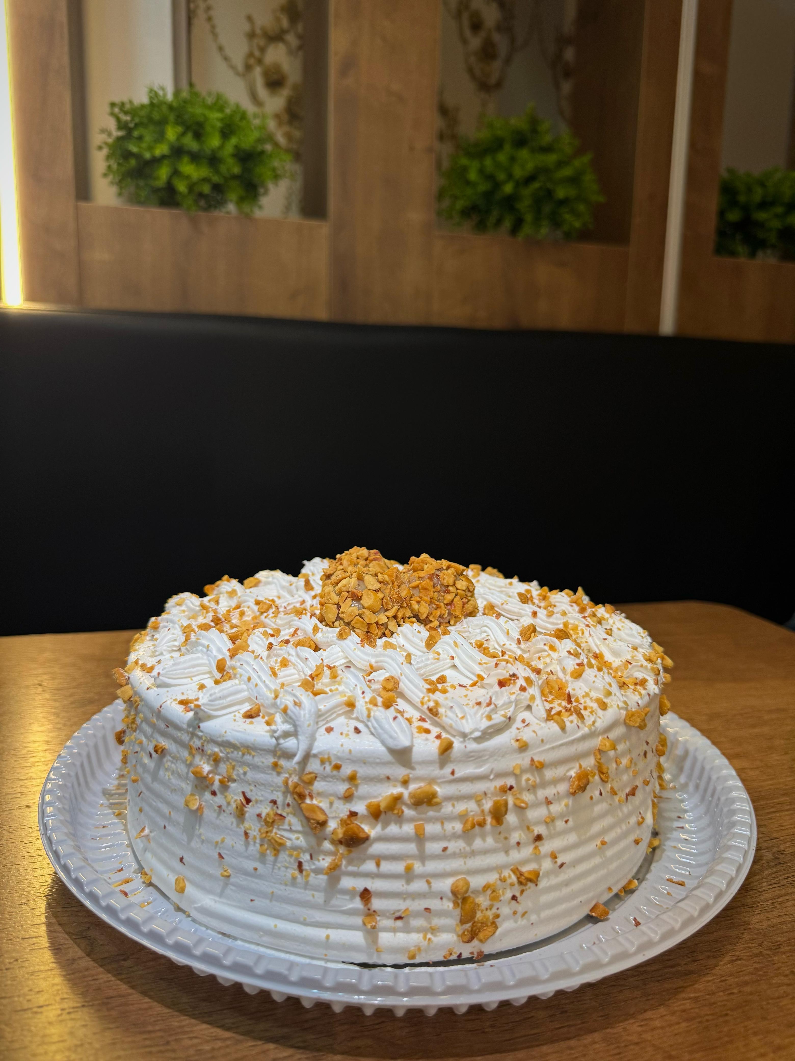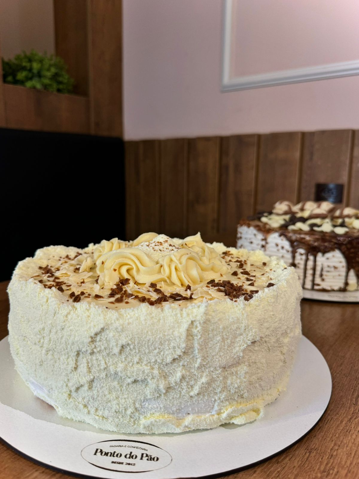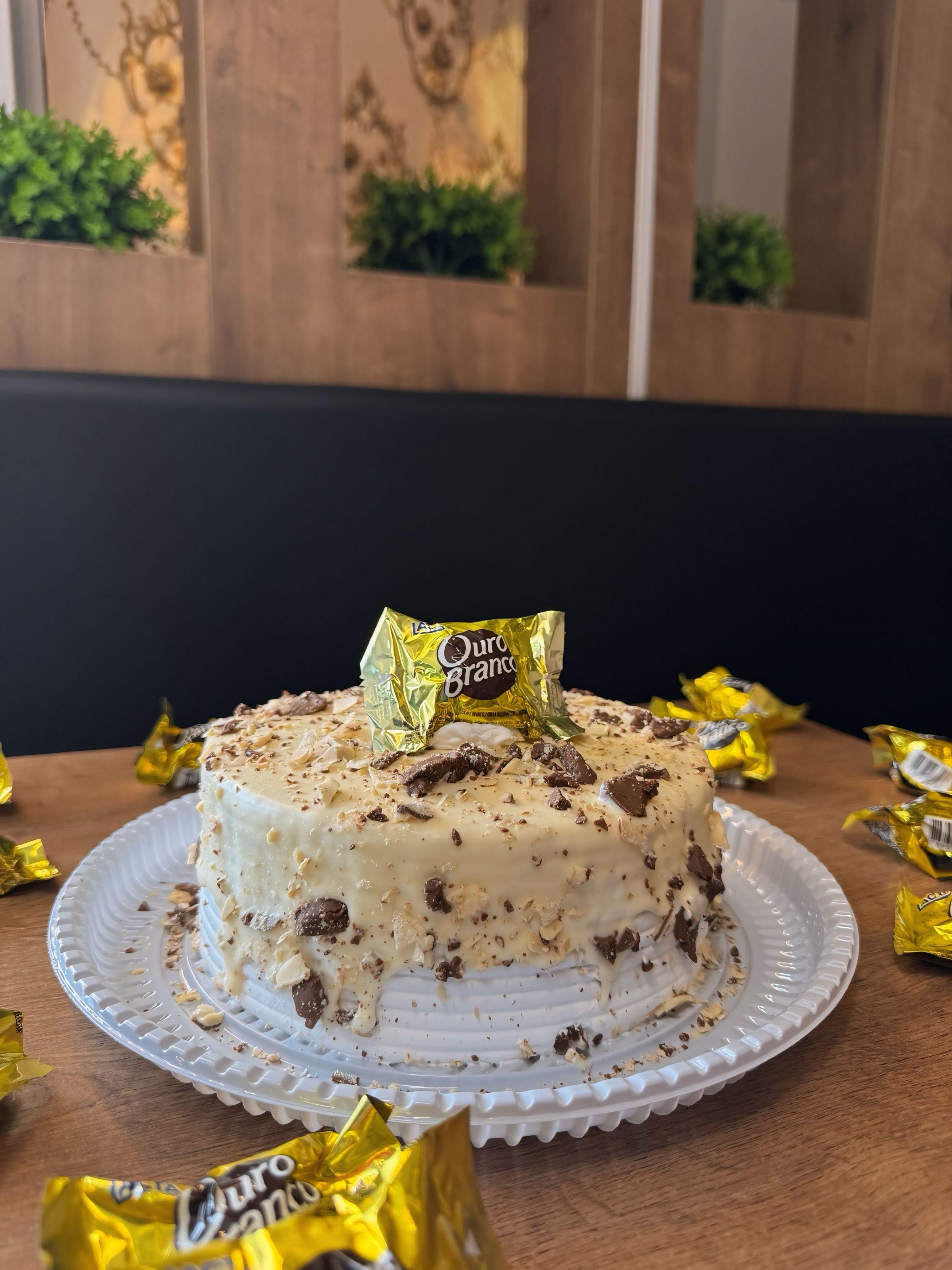 Massa: Pão de ló Branco Recheio: Creme 4 leites gourmet (cozido) Decoração: Ganache chocolate branco, crocante de doce de leite e leite ninho