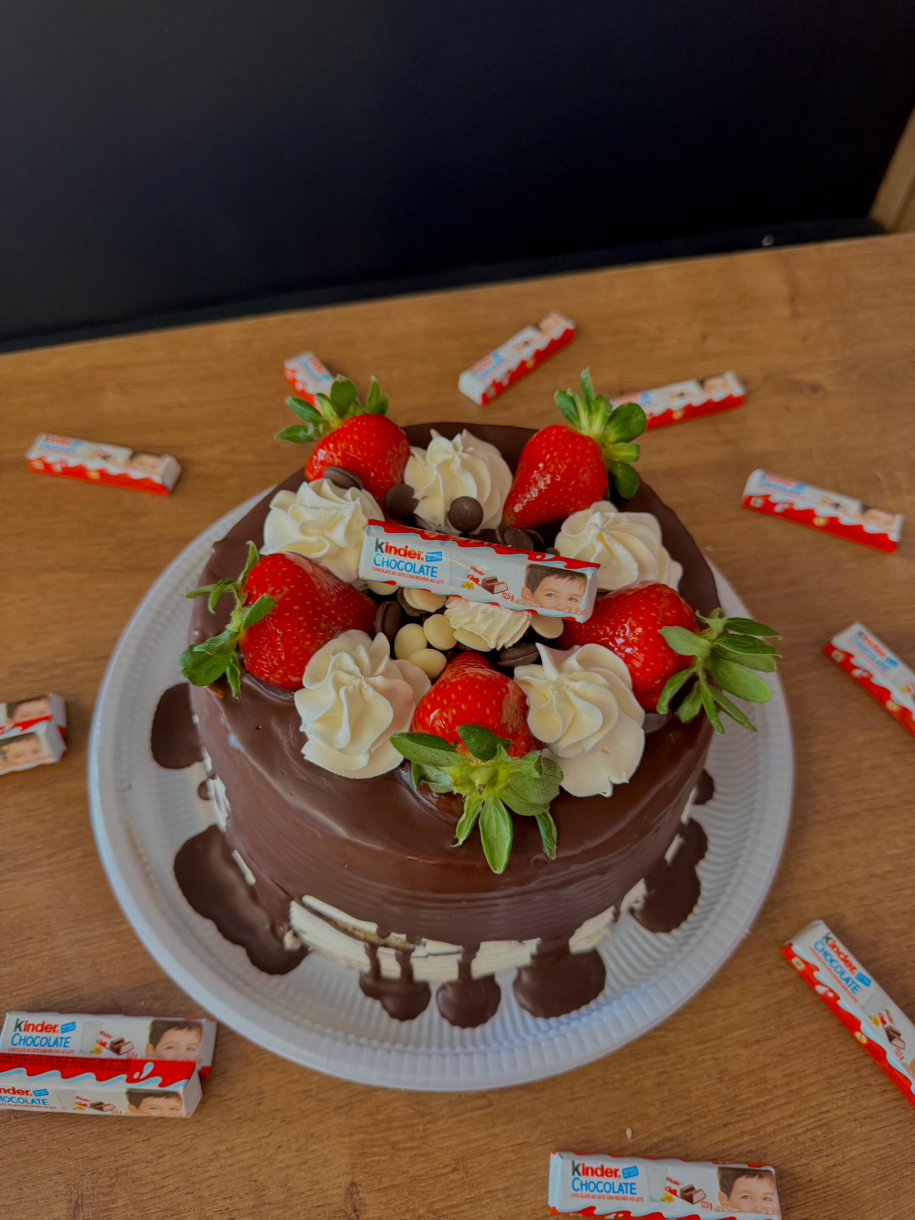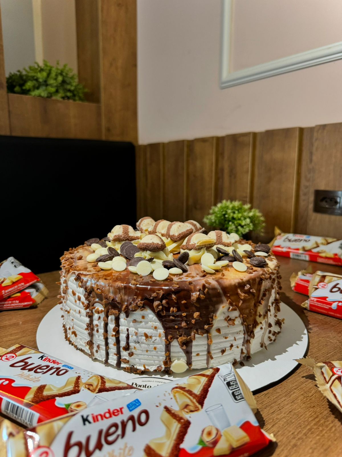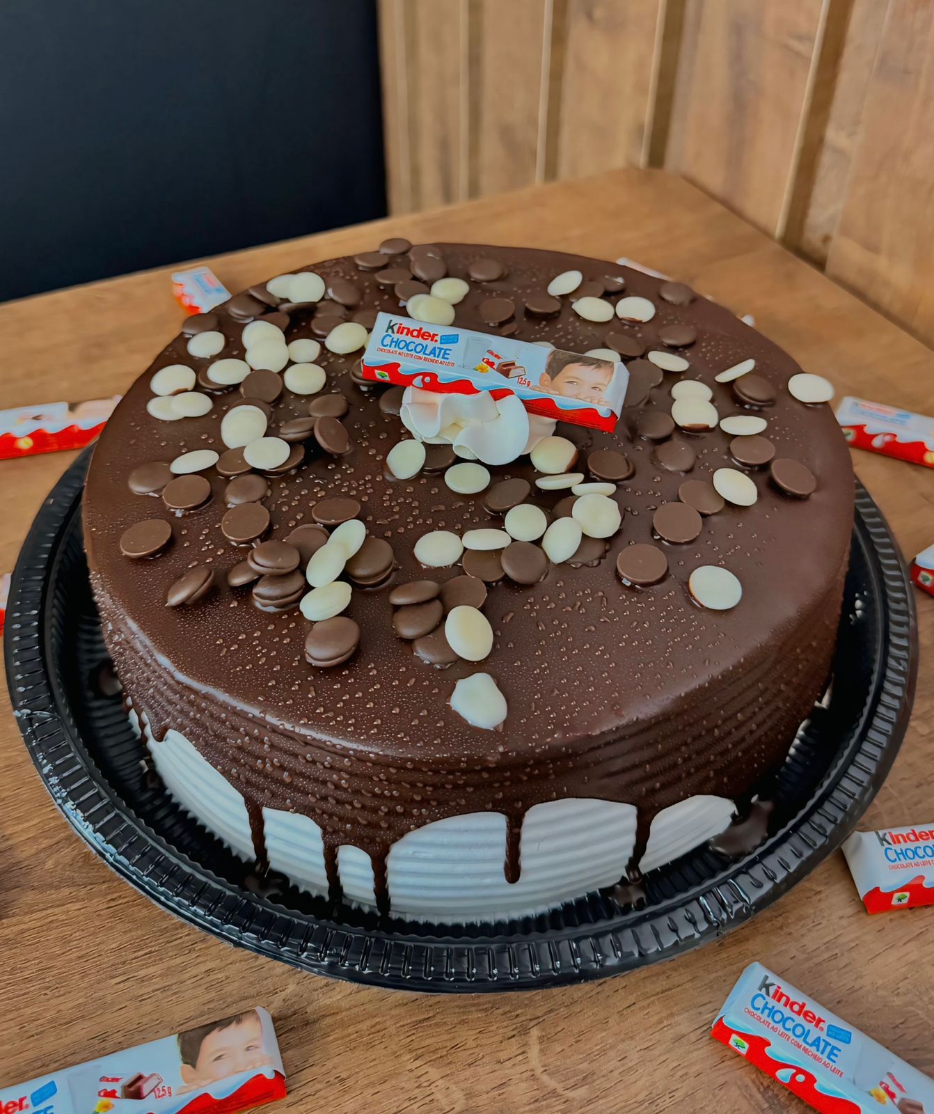 Massa: Pão de ló Branco Recheio: creme de kinder Decoração: ganache de chocolate ao leite com gotas de chocolate