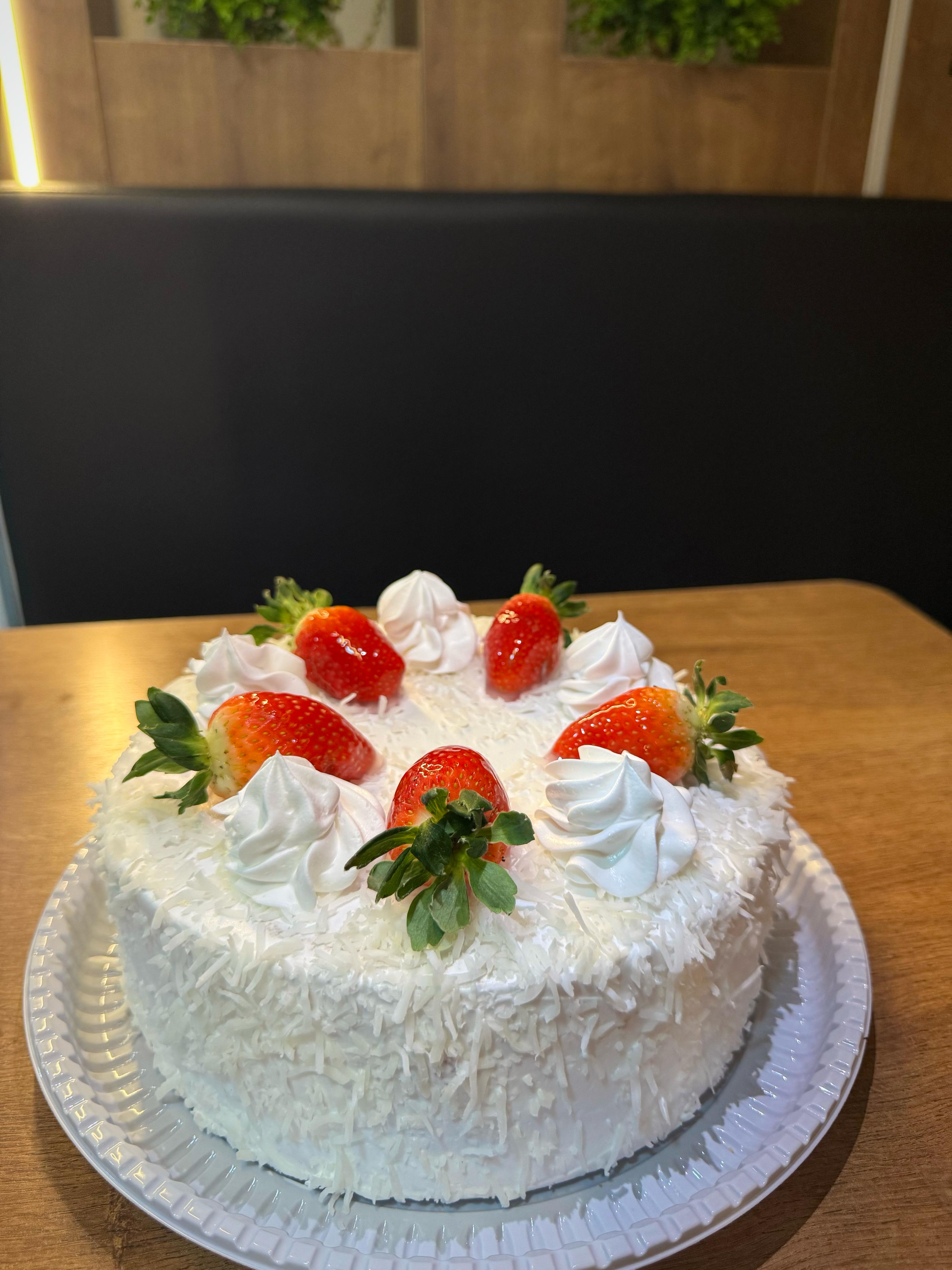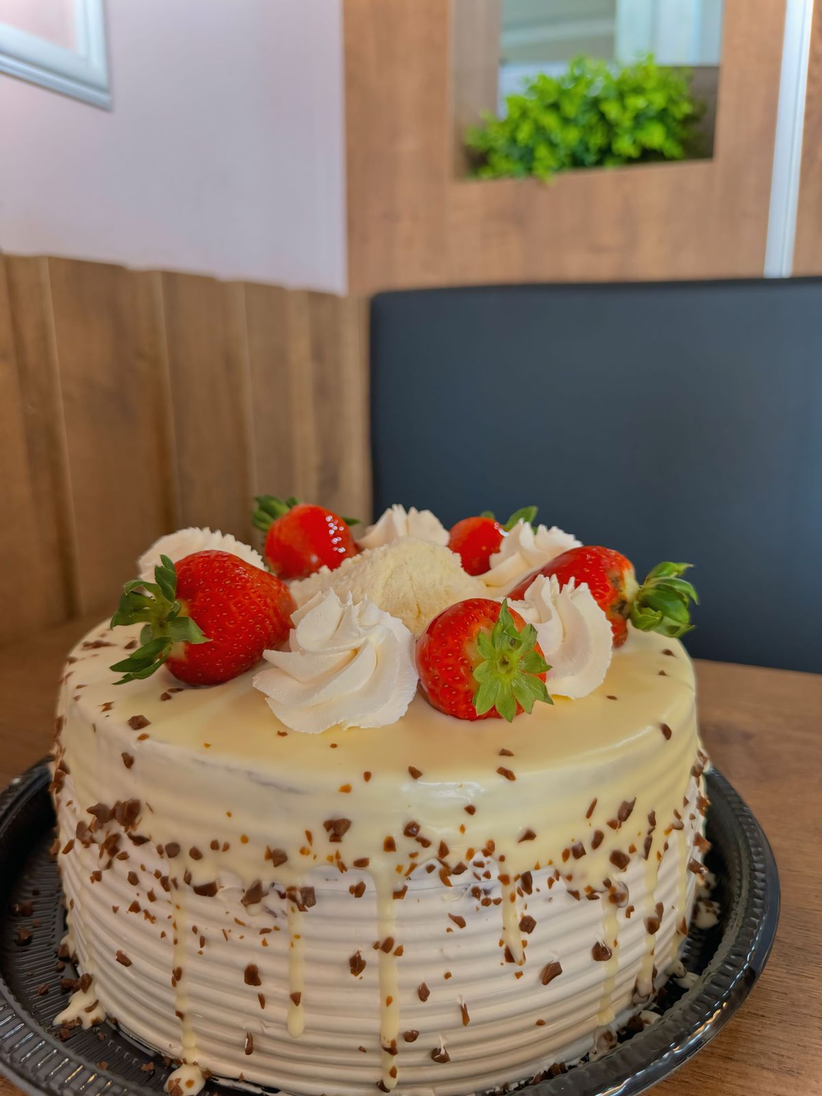 Massa: Pão de ló branco Recheio: Creme de beijinho com morangos Decoração: Ganache branco com morango e beijinho.