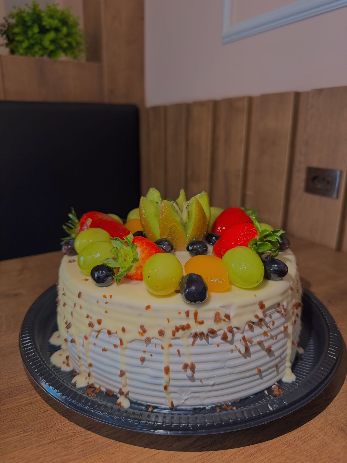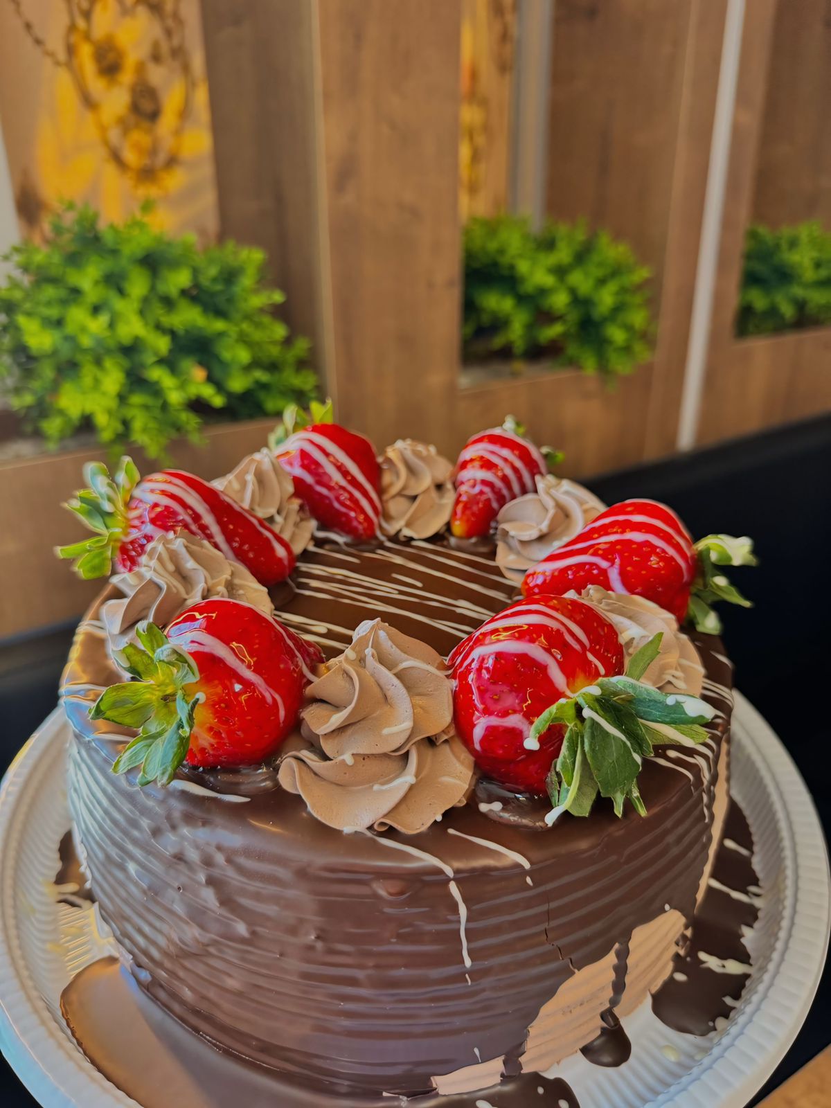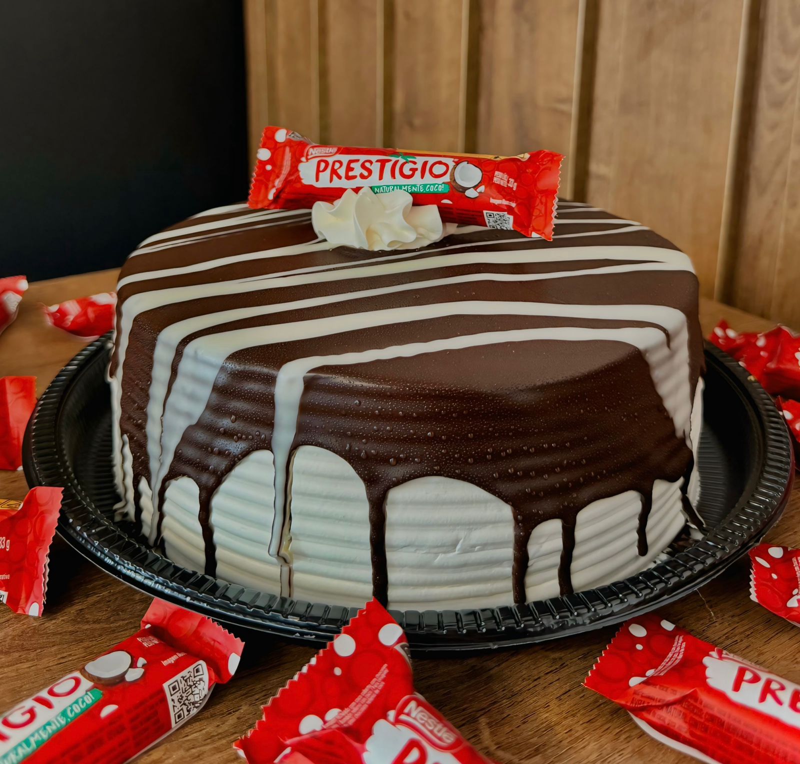 Massa: Pão de ló Branco ou chocolate Recheio: Chocolate com bombom ao leite Decoração:
