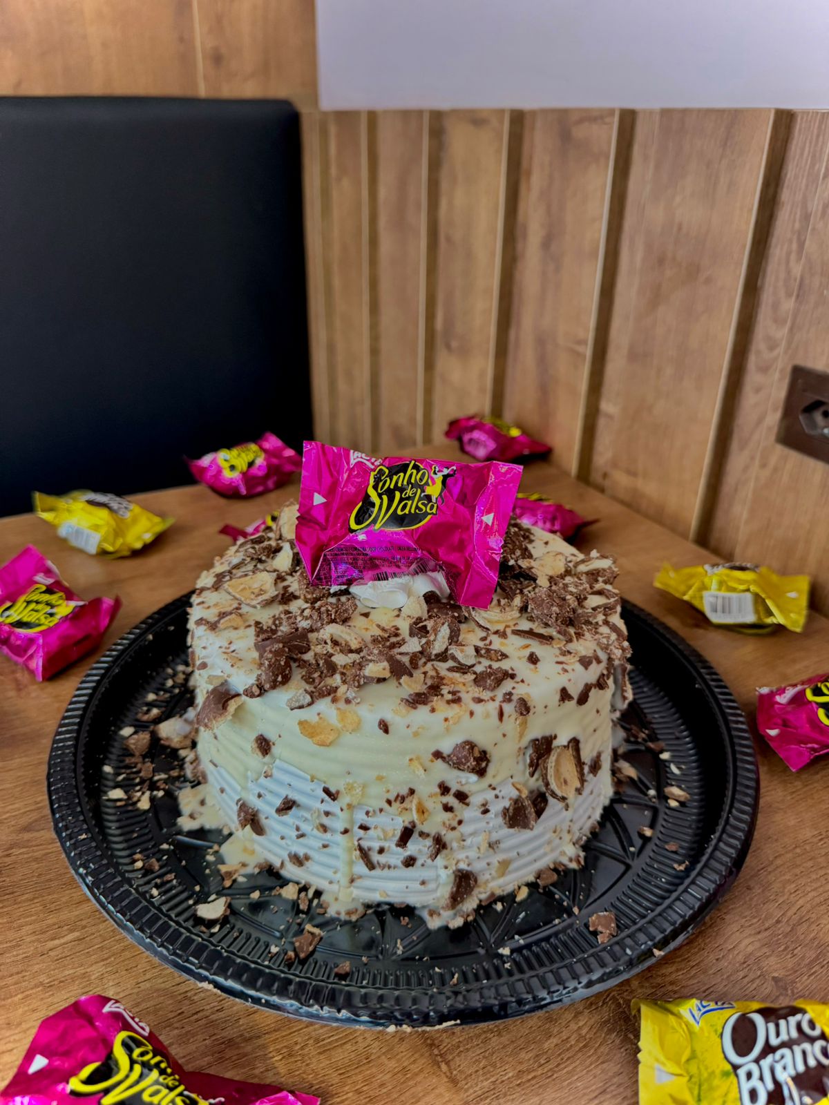 assa: Pão de ló Branco Recheio: Creme 4 leites Decoração: Ganache chocolate branco, crocante de doce de leite e leite ninho