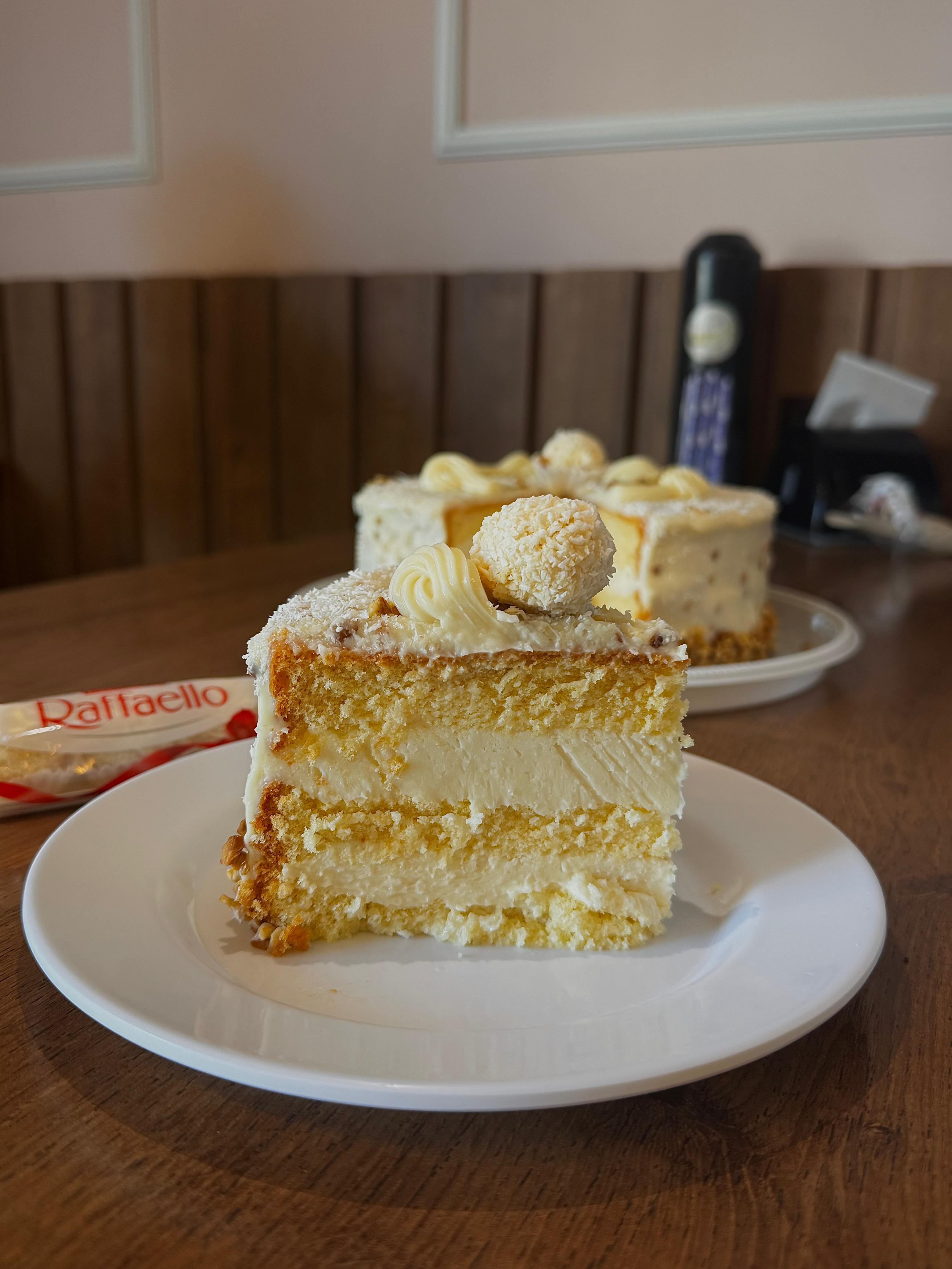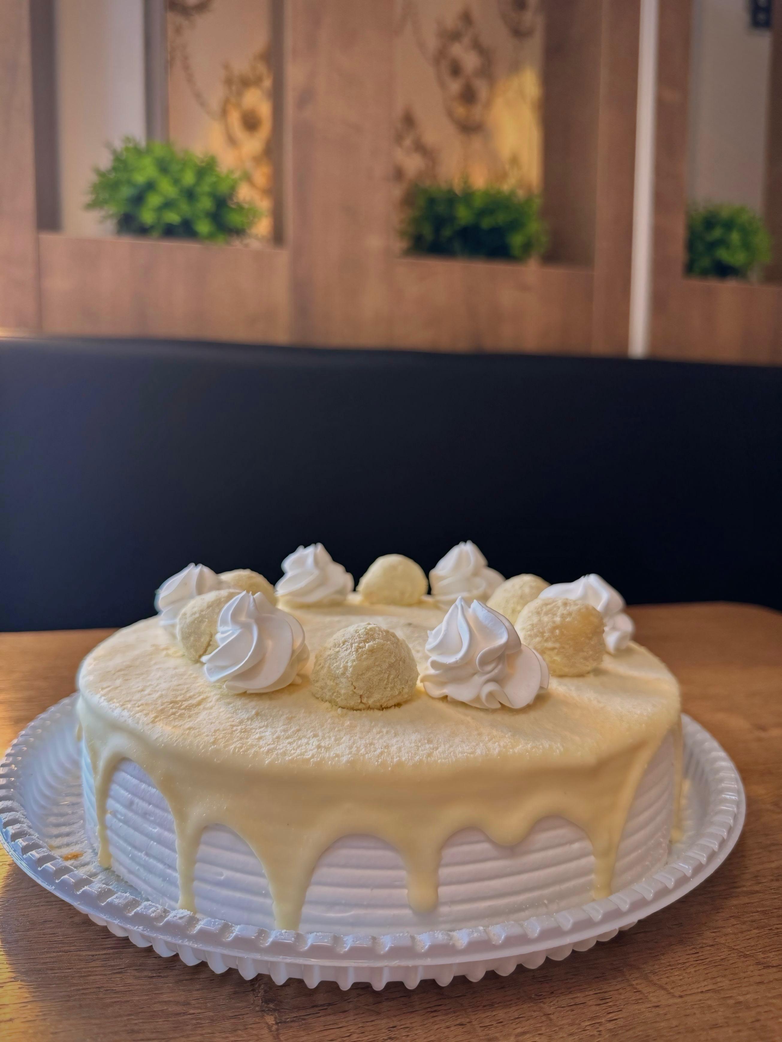 Massa: Pão de ló branco - Recheio: creme de raffaello - Decoração: creme de raffaello com coco ralado em cima.