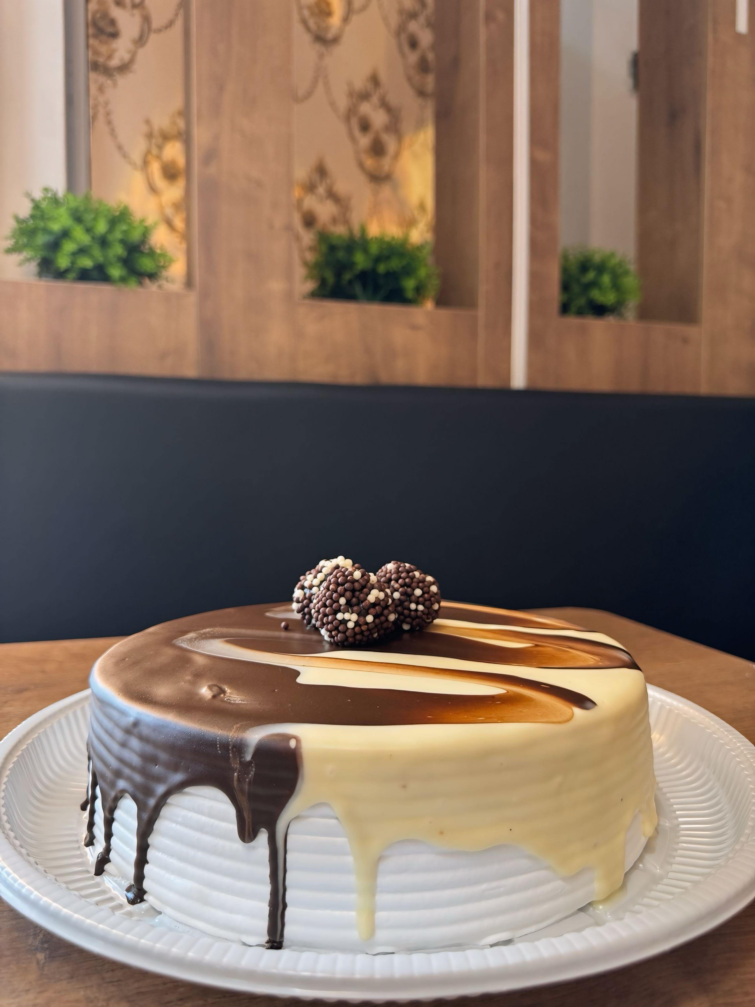 Massa: Pão de ló branco Recheio: Brigadeiro de ninho Decoração: Ganache branco com brigadeiro de ninho