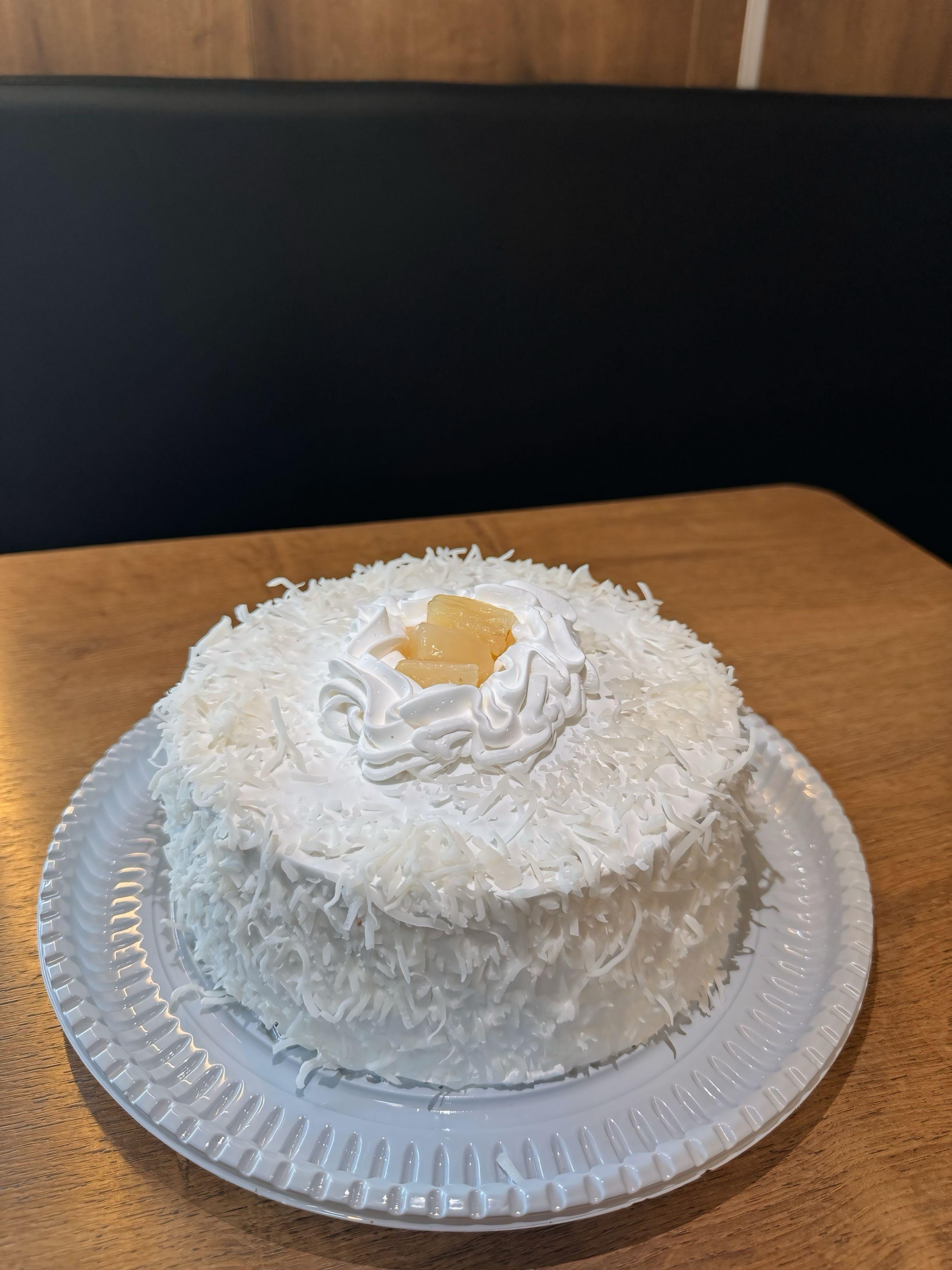Massa: Pão de ló Branco Recheio: Creme de coco com abacaxi Decoração: Coco com abacaxi