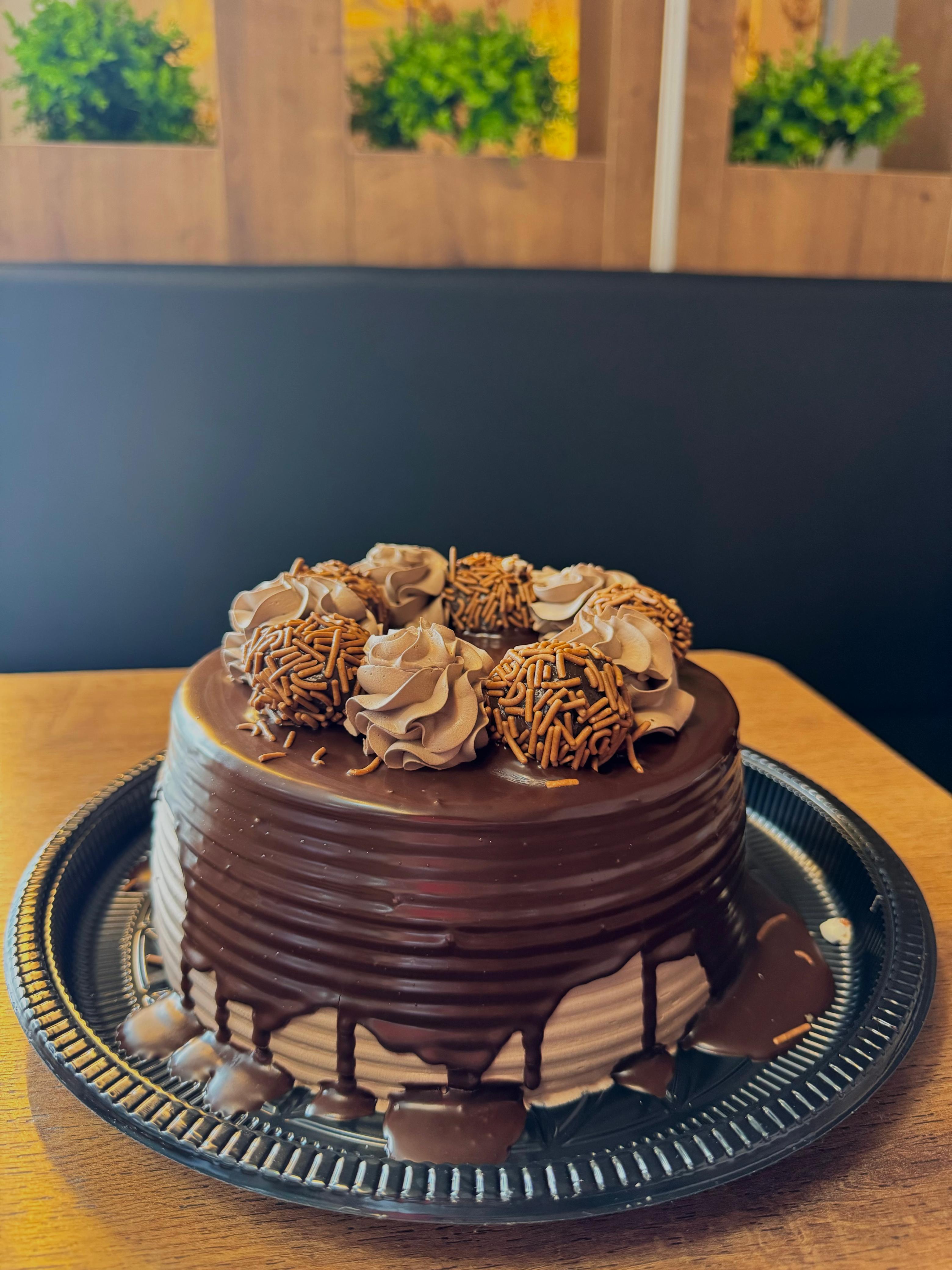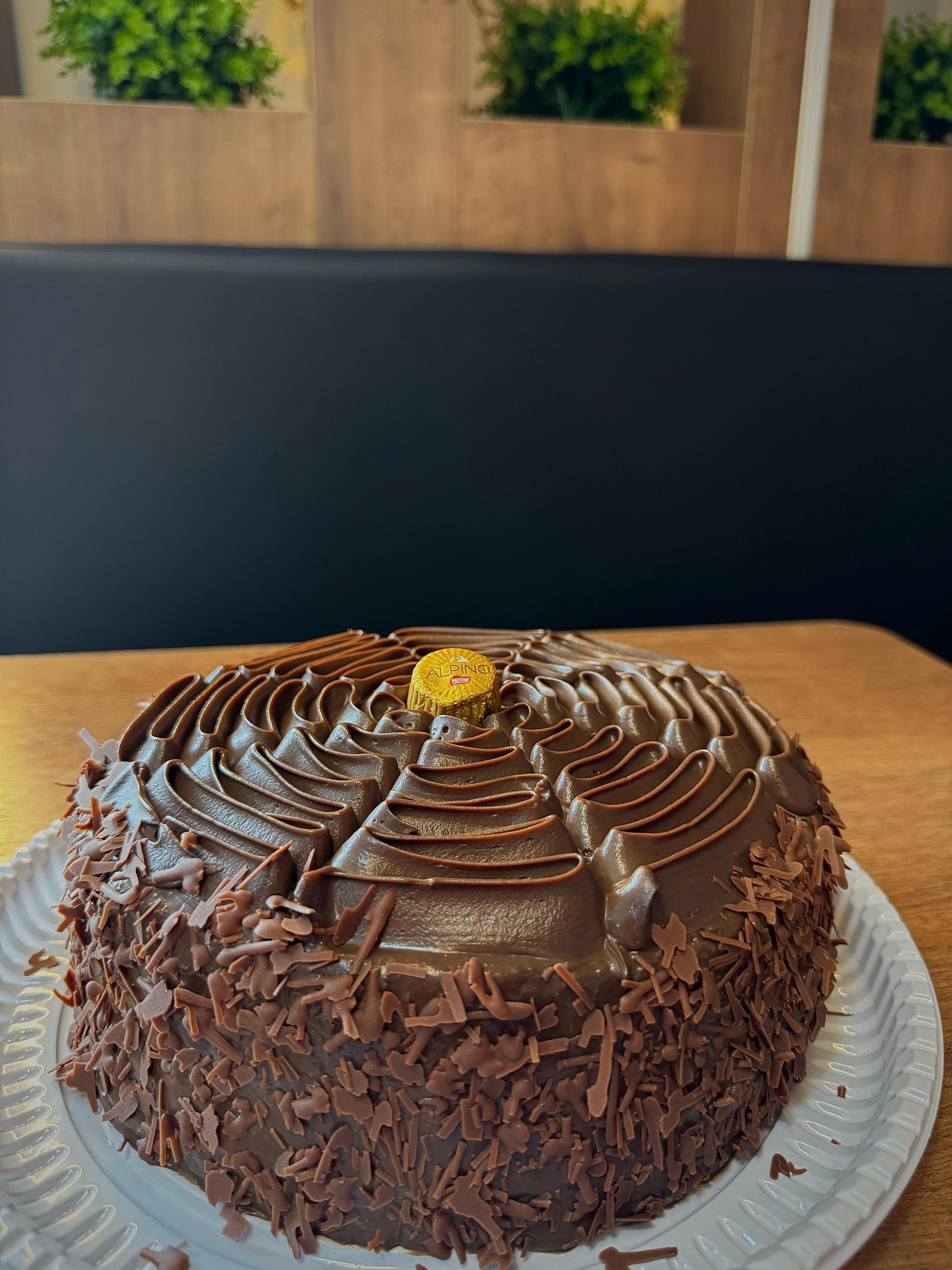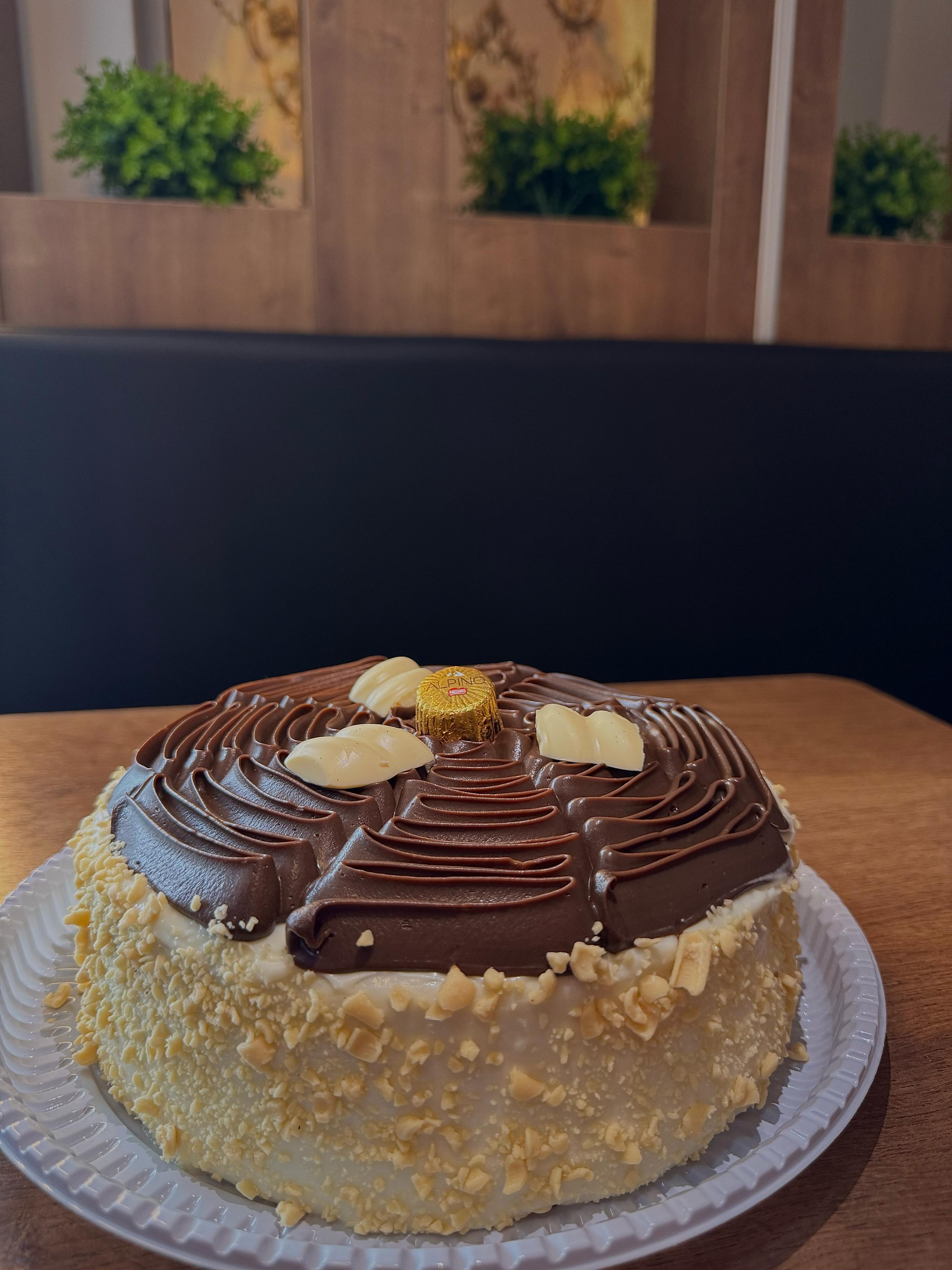 Massa: Pão de ló de chocolate Recheio: Creme de Ferrero Rocher Decoração: Chocolate com avelã crocante e Ferrero