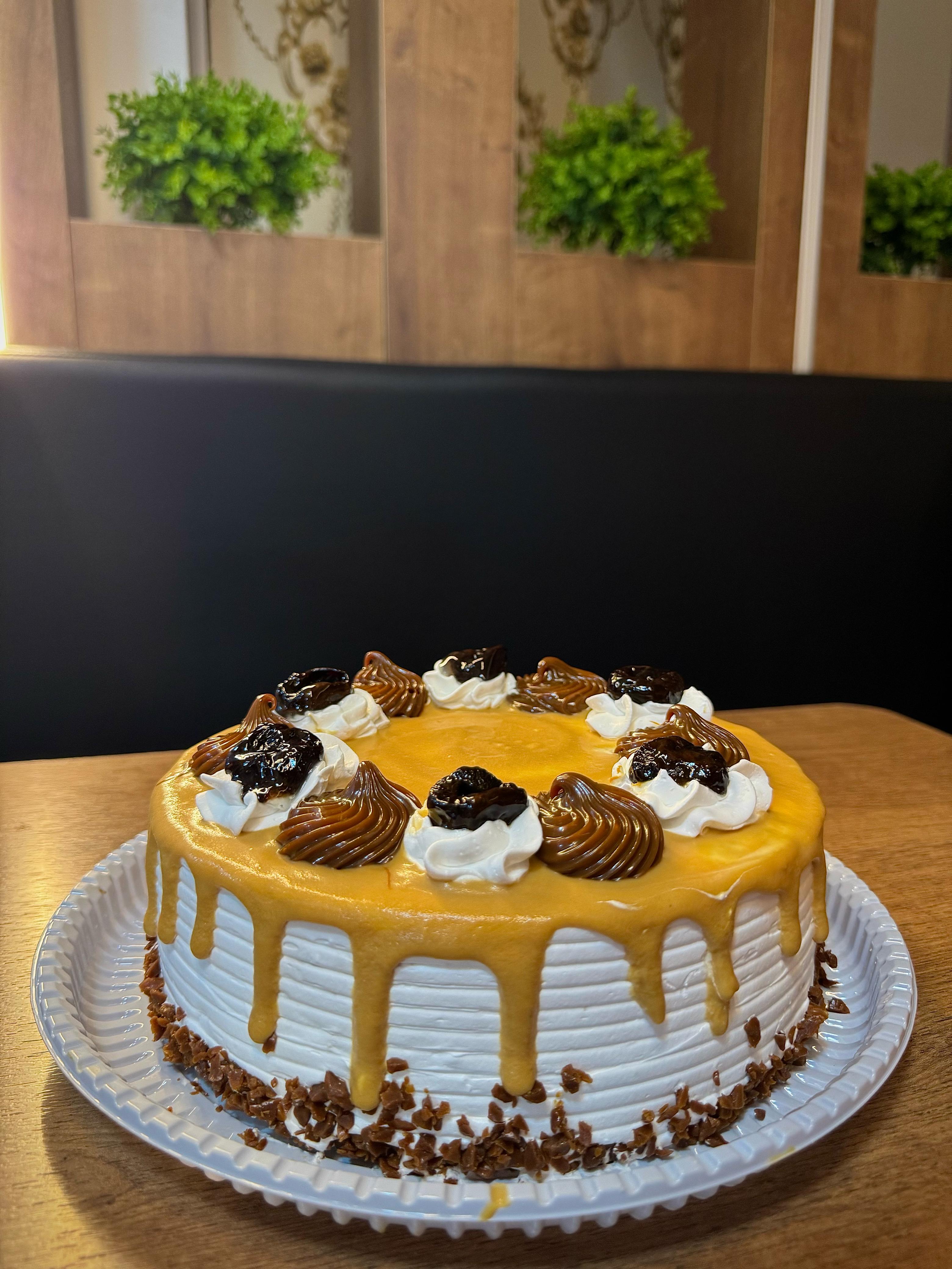 Massa: Pão de ló Branco Recheio: Creme de doce de leitecom ameixa Decoração: Doce de leite com ameixa